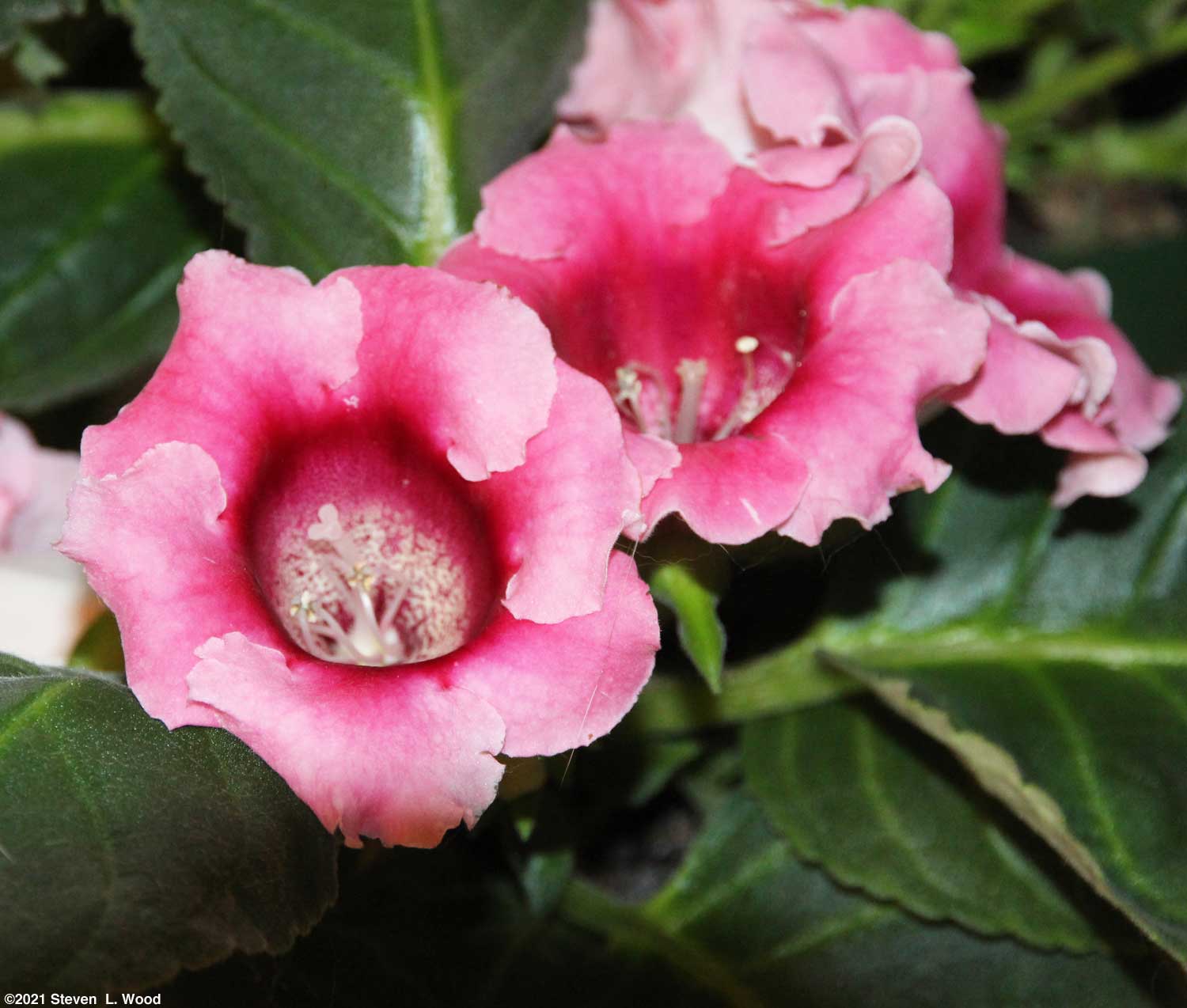 Combined with the peas I didn't cook last night, today's picking should nicely fill a pint Ziploc Freezer Bag. Before the rain paused, I did a number of normal household chores. But I realized that I needed to label our newly blooming Empress gloxinia plants. Such jobs rarely get done on sunny days when I can be working outside. Each plant has a plastic plant label identifying the variety and date seeded. This morning, I added a second label to each plant in bloom that I hadn't previously labeled identifying its bloom color and noting double blooms when evident. Such labels are helpful when the plants are emerging from dormancy. All but two of the plants in bloom shown above are from a December seeding. A double pink just barely visible in the back of the shot and a white closer to the camera are older plants. The double pink's corm outgrew its six inch pot last year. When it broke dormancy several months ago, I moved it to the only appropriately sized pot I had for it, an eight inch hanging basket pot.
