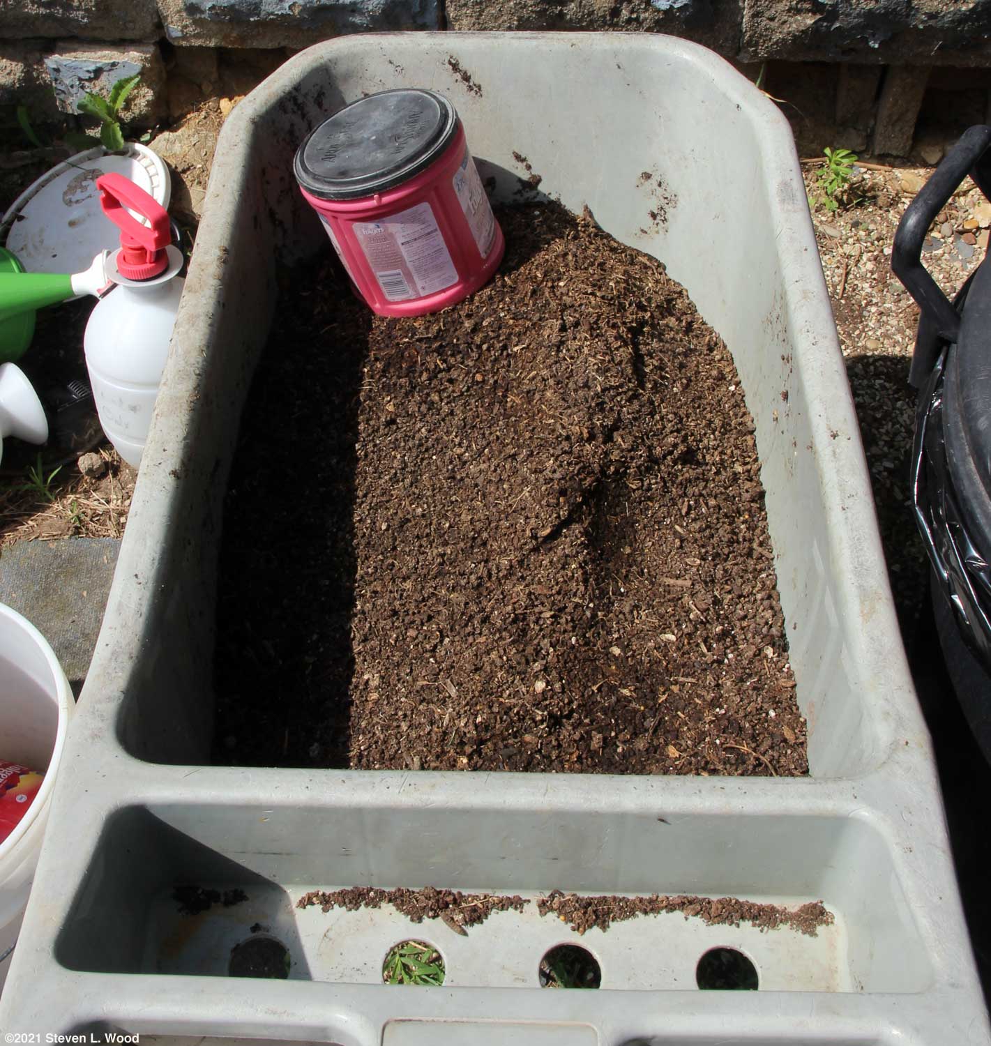 Progress has been slow, but at least I'm getting some things transplanted. I put in four tomato plants, four paprika pepper plants, a hill of yellow squash, and a hill of cantaloupe. Part of the slowness of the process, beyond the heat spell we're experiencing, has been a change I've made in doing our deluxe planting holes. I usually mix lots of peat moss with the native soil in the East Garden. But since we have a productive finished compost pile, I'm planting into a mix of mostly compost and peat moss mixed with a little of the soil dug. The compost pile is shown in the upper left of the photo below along with my $1 farm auction wheelbarrow. The wheelbarrow gets filled with all the undigested material screened out of the compost and then gets dumped on our current compost pile. Our working compost pile got a shot of compost starter this evening. The recipe for the compost starter concentrate is a cup of household ammonia, a 12 ounce Coke (regular, not diet), and a quarter cup of dish detergent. The late garden author Jerry Baker recommended using a hose end applicator at a 15:1 water-concentrate ratio, but I just poured a bit of the concentrate in a 2 gallon plastic watering can that I reserve for this task. I've been on a bit of a sprint during some good, but very warm weather this last week. I felt sure that the soil in our East Garden would finally dry out enough to be tilled. It did, but just barely. I tilled today. Thunderstorms are rolling in this evening as I write.