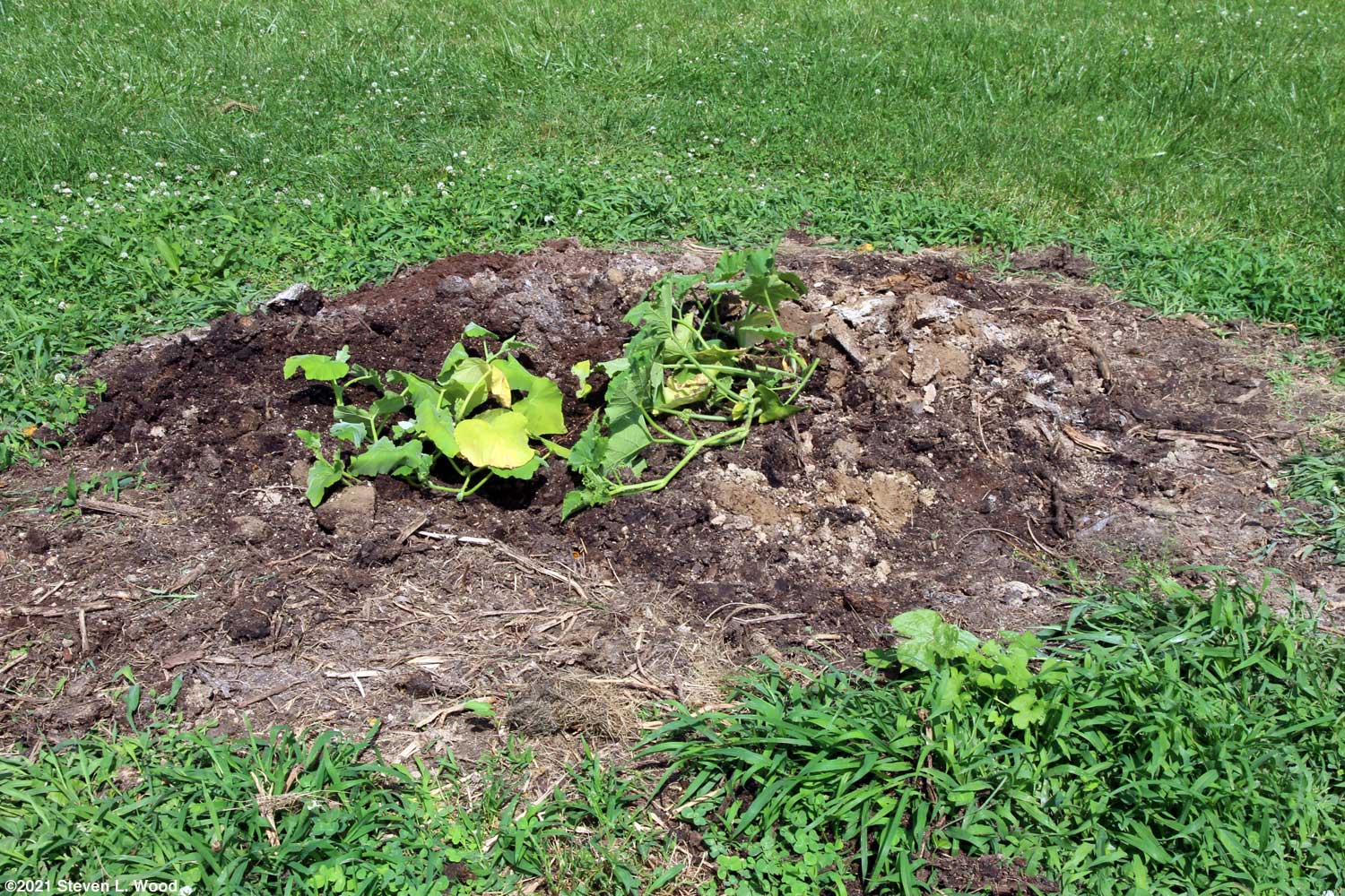 With it now being officially summer, I gave the butternut transplants a wider and deeper hole than usual, about two feet wide and a foot deep. I mixed peat moss, compost, 12-12-12 fertilizer, and lime in the holes, working it with a shovel into the native soil on the sides and bottom of each hole.