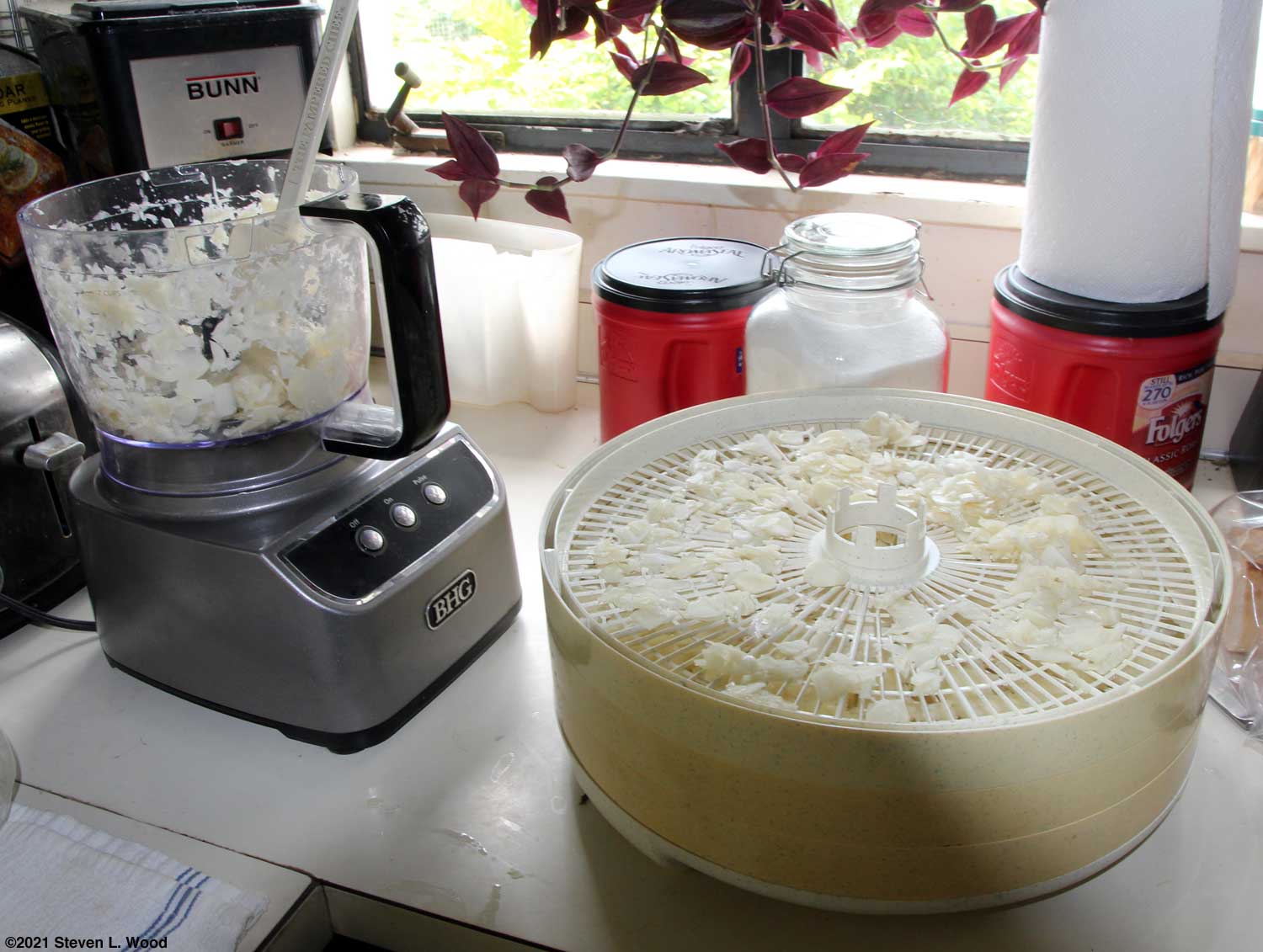 We didn't have all that many cull garlics which I usually use for making the powder. This time around I used two elephant garlic and around ten standard garlic bulbs. Today's job was to clean and peel the garlic cloves and run them through our food processor with its slice blade. The pasty slices then got spread across the trays of our food dehydrator. I once started dehydrating garlic in the house. That was a major mistake. Just from peeling the garlic, our kitchen reeks of garlic. I took the loaded food dehydrator to the garage and set its thermostat at 105° F. As the drying progresses, I'll cut it back to 95° F to prevent burning the garlic. It will probably take two or three days for the garlic to dry. When that occurs, I'll run the garlic through an old coffee grinder that we use only for jobs like grinding garlic or powdering herbs. I give a more complete description of making garlic powder in a September, 2015, posting.