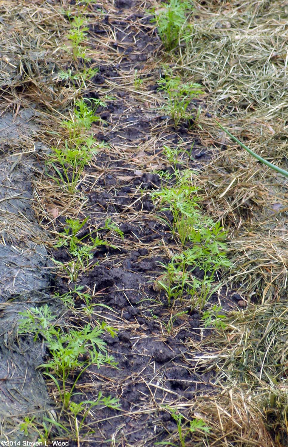 After seeding the radishes, I pinch the soil closed over the carrot and radish seed and pat it firm with my hand. Sometimes (almost always in fall plantings made in the dry months of July or August), I lay a walking board over the row to hold in soil moisture and hold back weeds. I didn't in spring, 2014, as I used some freebie, heavy duty plastic row labels I was given at our local garden center as dividers between the carrot varieties. See The Radish Murders and Grass Clipping Mulch for more information about using radishes as a nurse crop for carrots. Whether one covers the carrot row with walking boards or not, some watering will almost always be necessary for 7-10 days as the carrots germinate. Obviously, when either the radishes or carrots begin to emerge, the walking boards have to be removed from the row.
