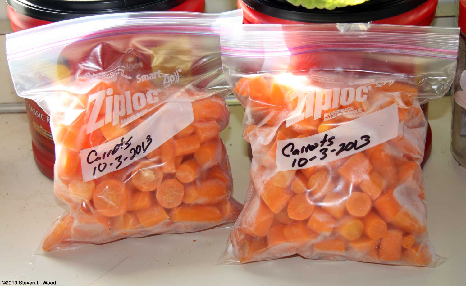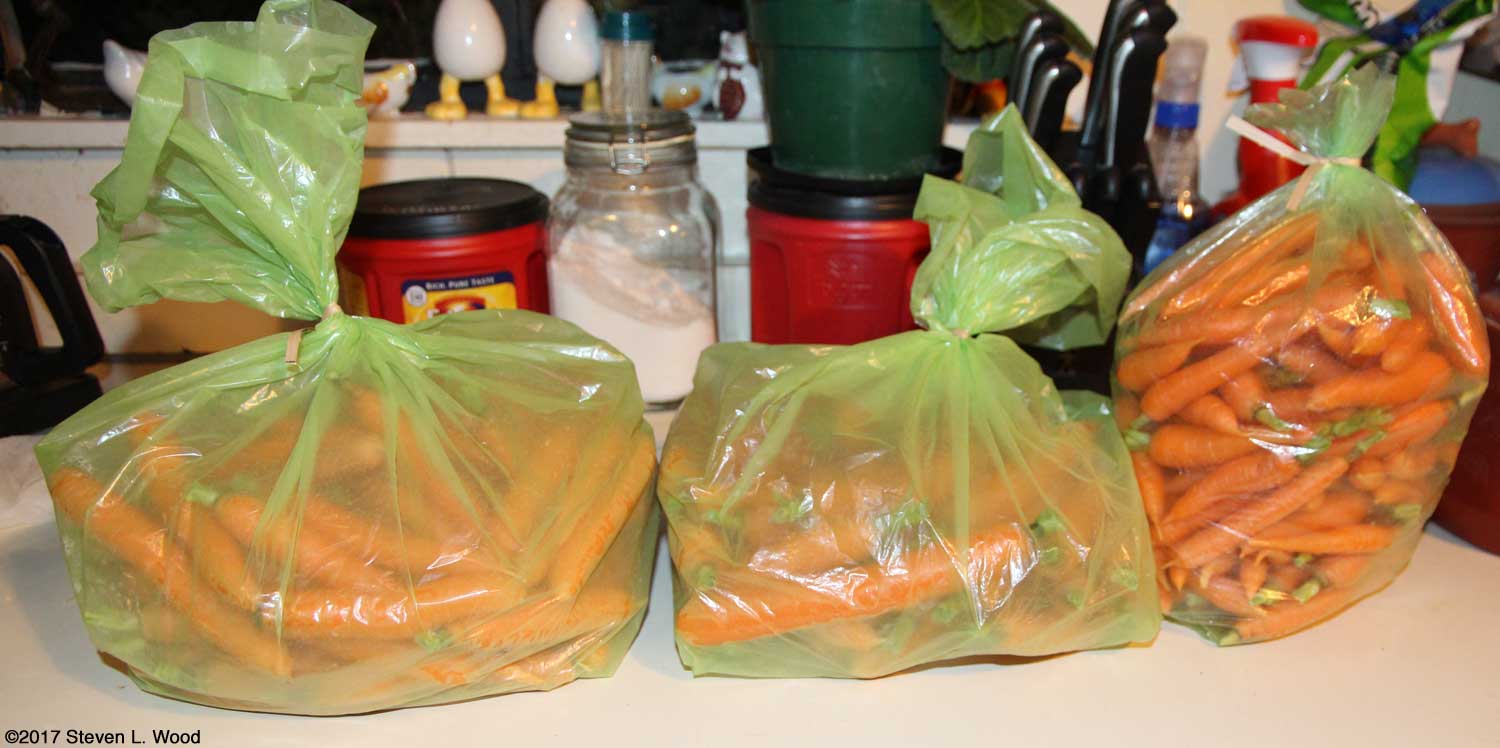 I then trim off the tops of the carrots about a half to a full inch above the carrot root. I also trim off any taproots from the bottom of the carrots. Then they go inside for a scrubbing with a vegetable brush and sorting. Cull carrots, those with blemishes, bug bites, splits, or any other imperfection that may cause them to spoil early in storage get set aside for fresh use or being cut for frozen cut carrots. Carrot tops and root tips trimmed eventually go onto our compost pile. After air drying, our carrots go into large Debbie Meyer Green Bags Most of our carrots go into the vegetable drawers of our refrigerator for long-term storage, but we don't waste the cull carrots. After peeling and chopping the carrots, they get a good rinse before being blanched (or scalded as the Ball Blue Book
