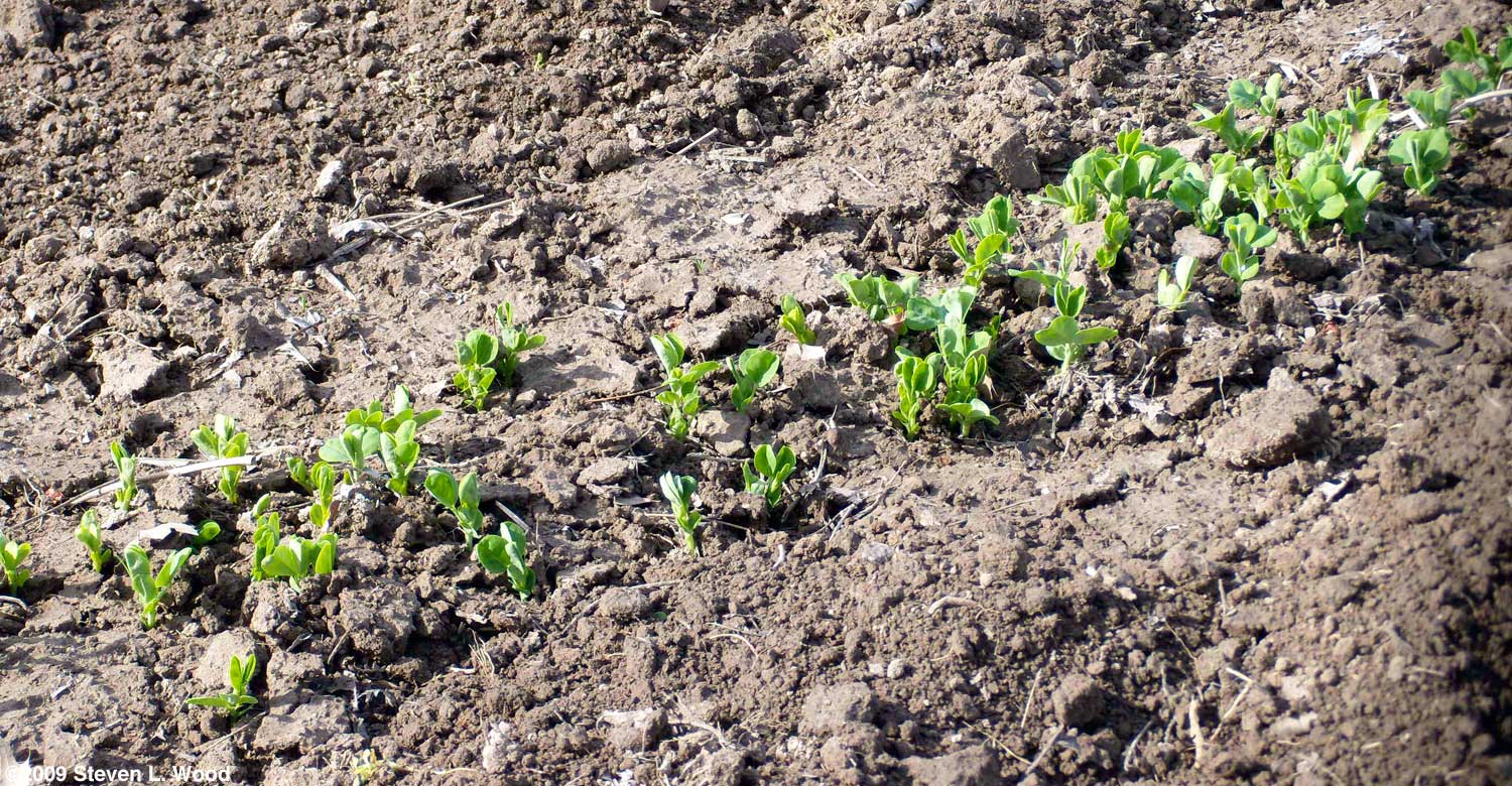 Our later planted short peas may require watering before they emerge if we have a dry April. When watering, one has to be careful not to flood the planting or wash up the pea seed. Our Eclipse and Encore pea varieties take one to two weeks to emerge. Trellising Peas