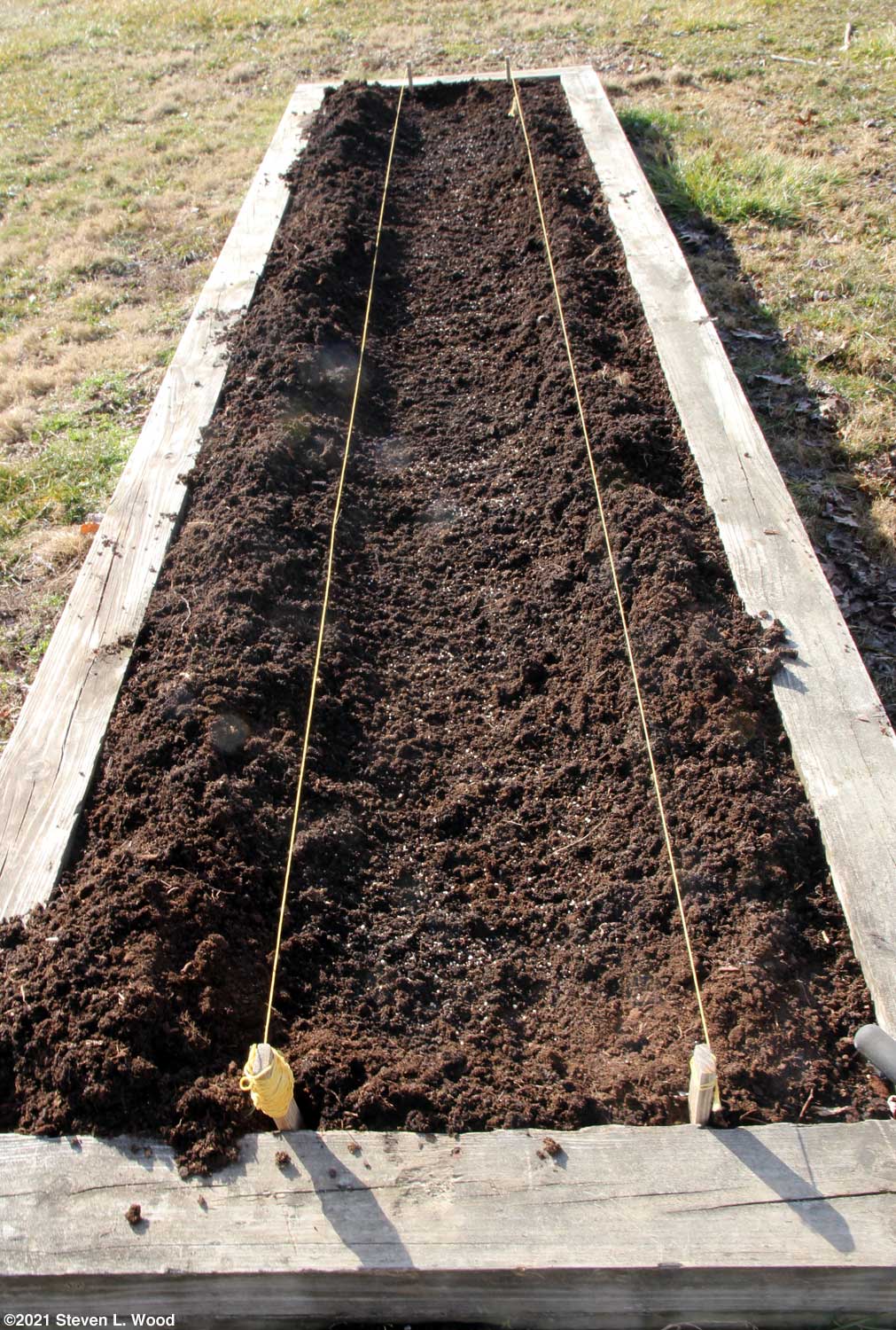 If the soil has thawed and dried enough to allow it, I use a garden hoe or rake to make a furrow about 14 inches wide down the row and about two inches deep for the pea seed. I spread a little lime, fertilizer, and granular soil inoculant